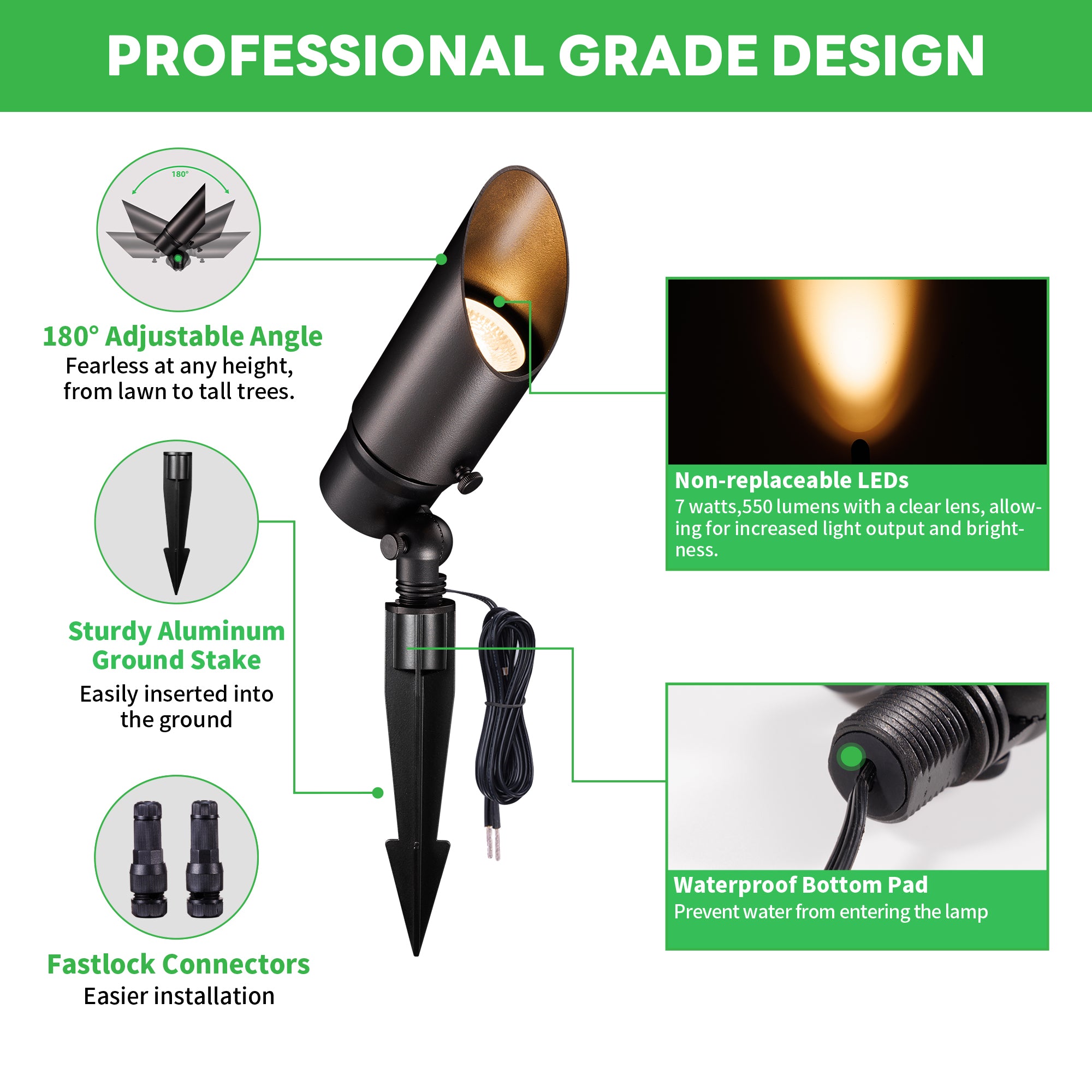 Applications:Spotlights are commonly used in landscape lighting, accent lighting, and theatrical settings where precise lighting is needed.