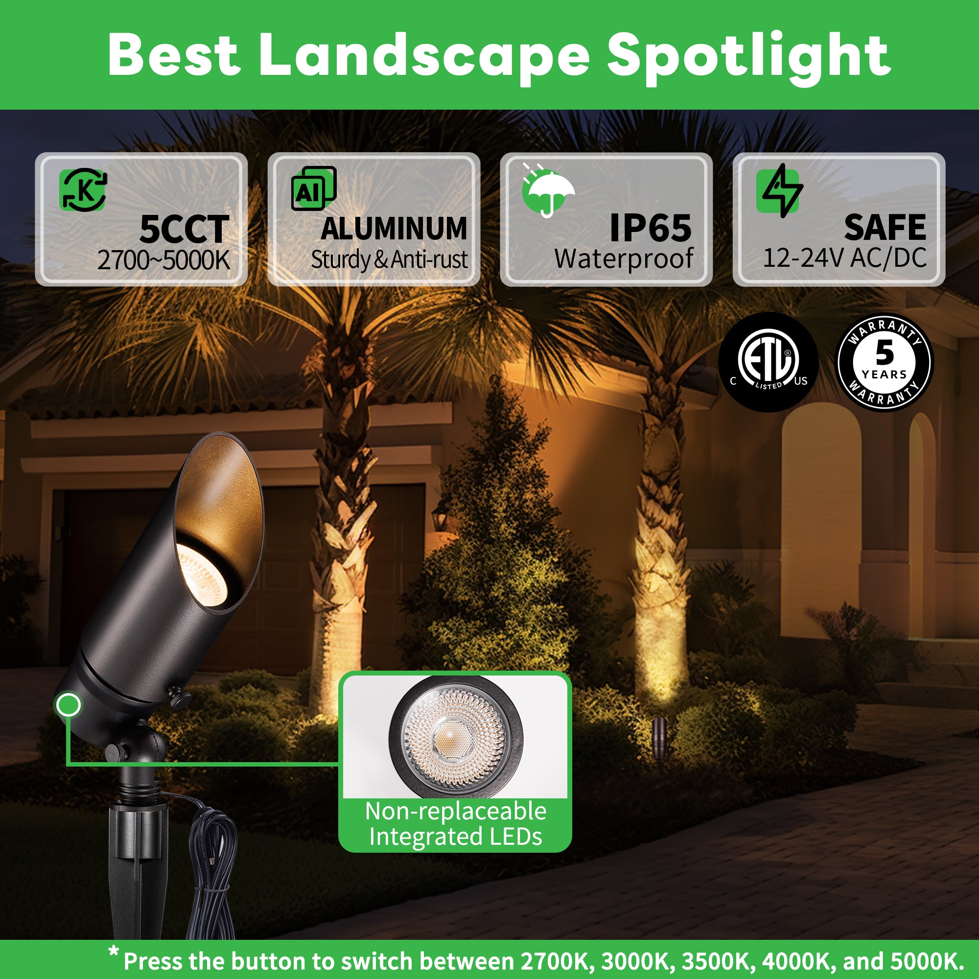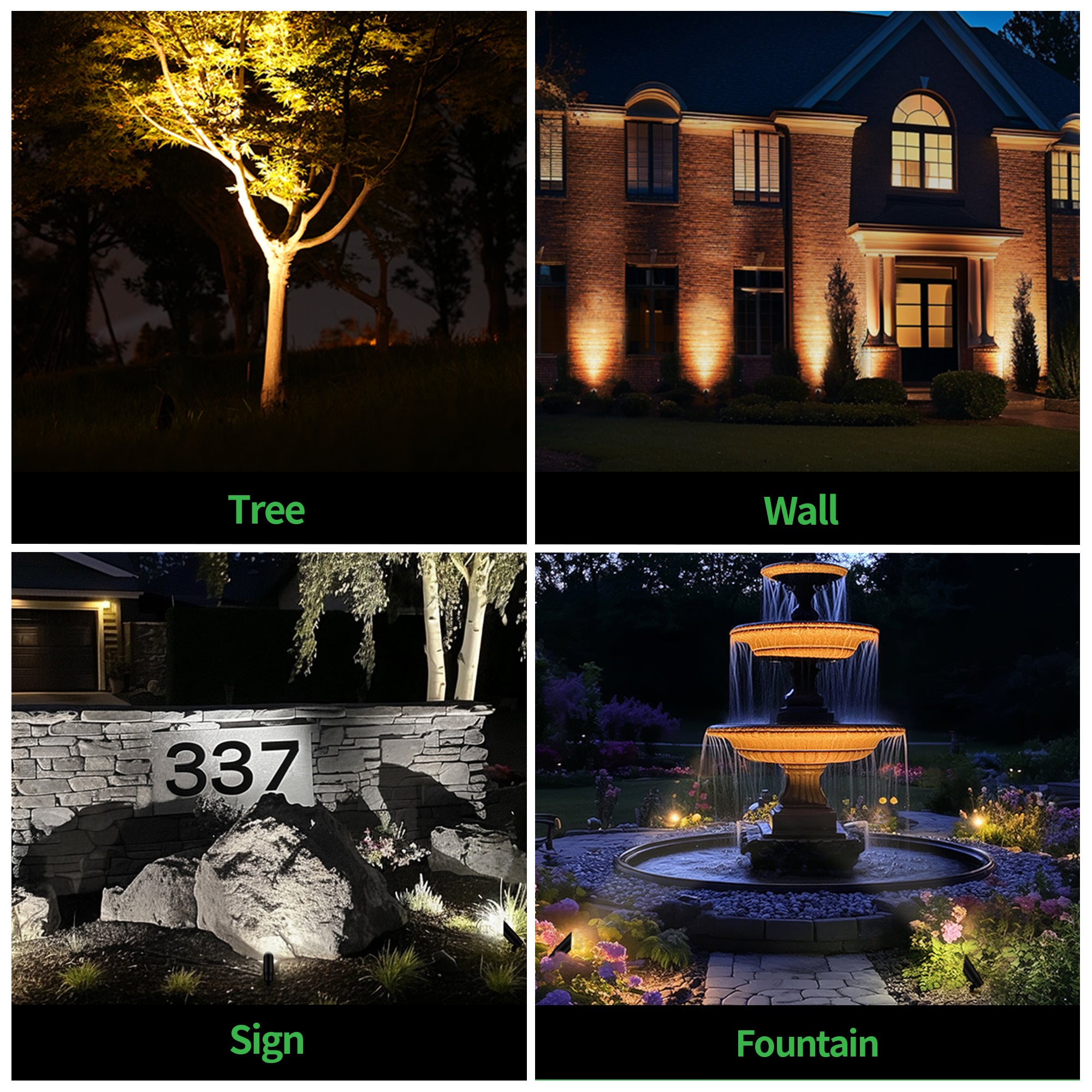 Varmtalys aluminum landscape spotlights deliver clean, controllable uplighting for trees, stone façades, and focal features. Built for 12V low-voltage systems, they’re safe, DIY-friendly, and designed to minimize glare while maximizing contrast. With adjustable heads, practical beam options, and durable weather-ready finishes, our spotlights help you shape nighttime curb appeal and highlight the details that matter. Whether you’re accenting a single specimen tree, washing a textured wall, or guiding attention to entry columns and sculptures, Varmtalys offers a range of beam angles, outputs, and color temperatures to match your layout and style. Select models include multi-CCT (3–5 CCT) for easy on-site tuning—warm and welcoming for everyday use, crisper whites when you want extra definition.