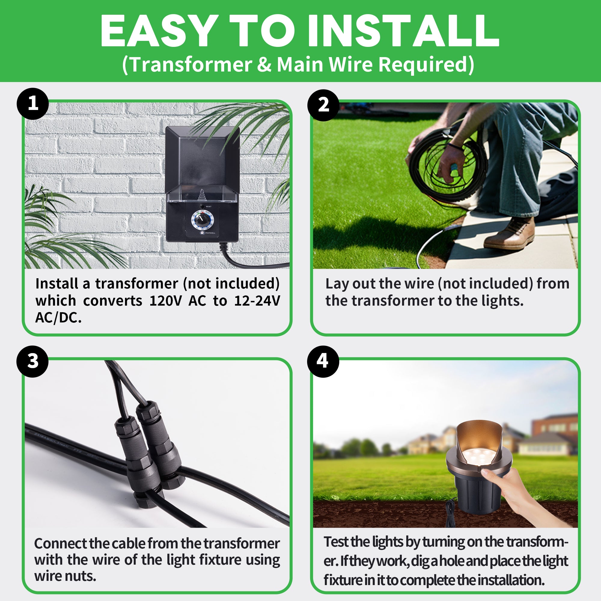 For example, if the transformer is 150W and each bulb is 5W, then 24 fixtures can be installed (150 x 80% ÷ 5).