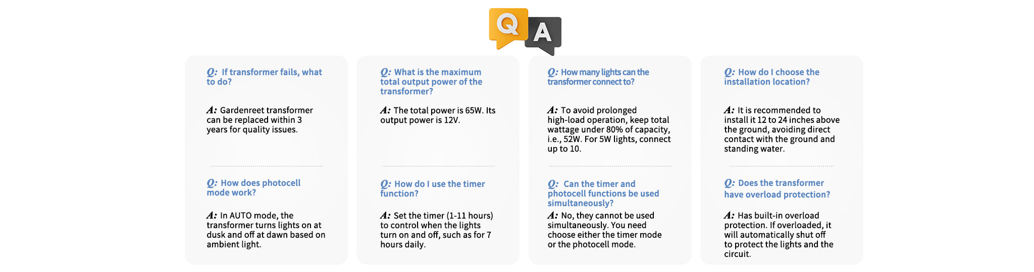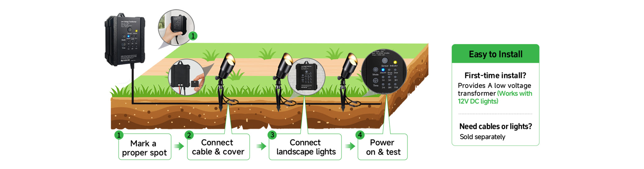 A: Yes, installation is DIY-friendly. Just connect your landscape lights to the transformer with low-voltage cable, plug it into a GFCI outlet, and you’re set.