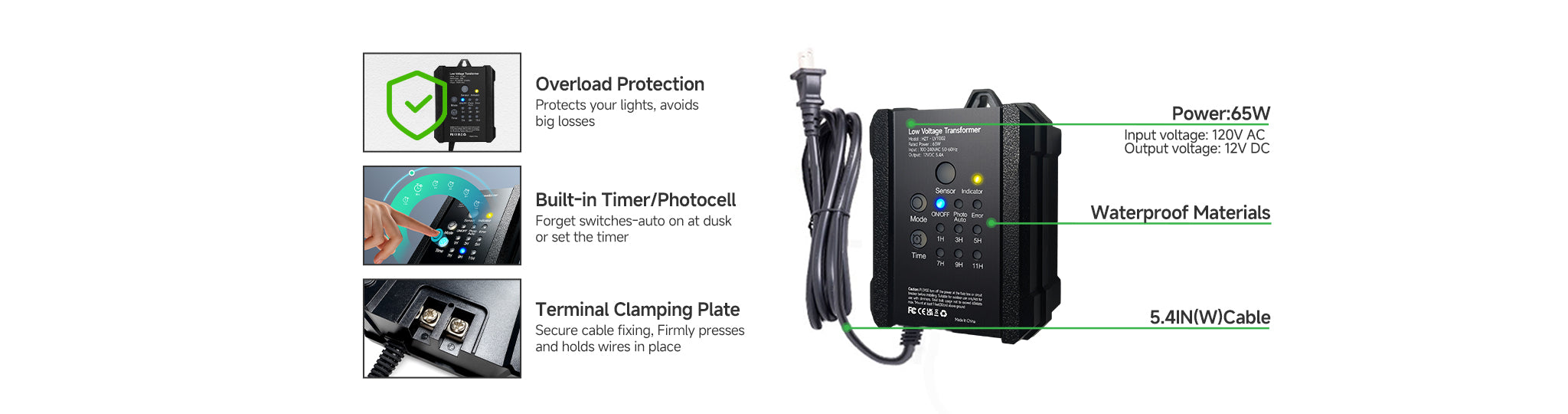 ⭐𝐁𝐑𝐈𝐋𝐋𝐈𝐀𝐍𝐓 & 𝐏𝐑𝐎𝐓𝐄𝐂𝐓𝐄𝐃 𝐏𝐎𝐖𝐄𝐑: With a robust 65W capacity, this low voltage transformerprovides reliable 12V DC power for all your LED outdoor lights. From pathway lights to spotlights, it ensures a stable, flicker-free current to create your dream garden lighting setup from a single, powerful source.